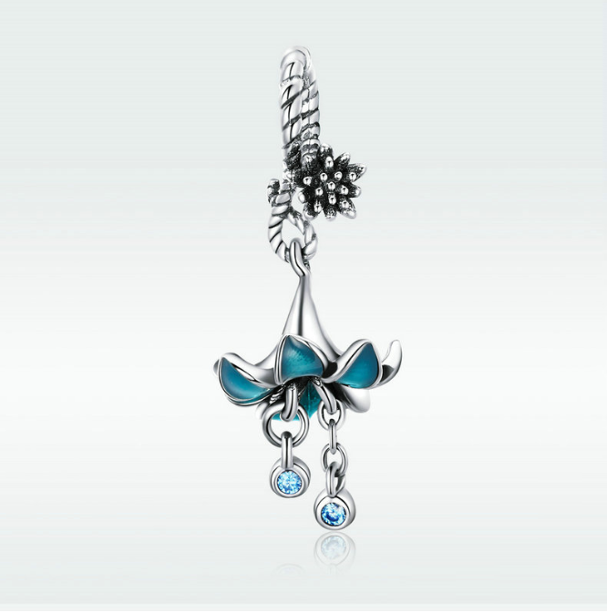 Blue Crystal Enamel Lily Flower Dangle Charm 925 Sterling Silver